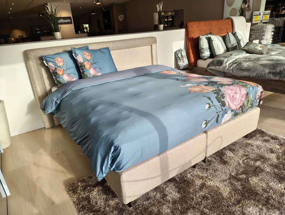 Showmodel Boxspring Goldline vlak 180x210 / Hoofdbord: Virgina / Stof: Spumante 200 Taupe / Poten: staal zwart / (excl. matrassen)